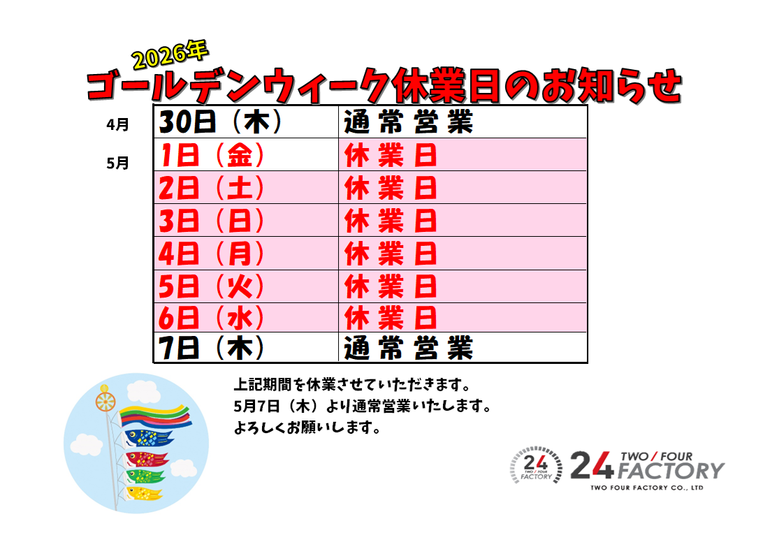 ゴールデンウィーク休業日のお知らせです。